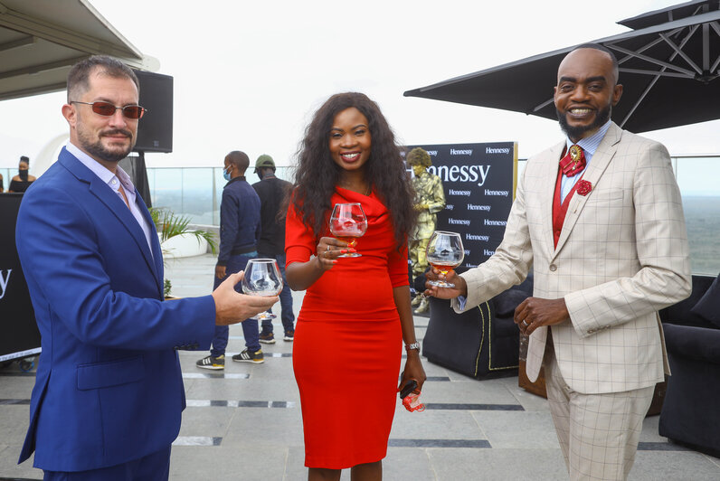 Alexandre Helaine, Marketing Manager Eastern Africa, LVMH, and Vincent Ochieng, Radio Personality, pose for a photo with Lucia Musau, CEO Africa Elite PR, during the 150th year celebration of Hennessy XO in Nairobi, Ole Sereni Hotel