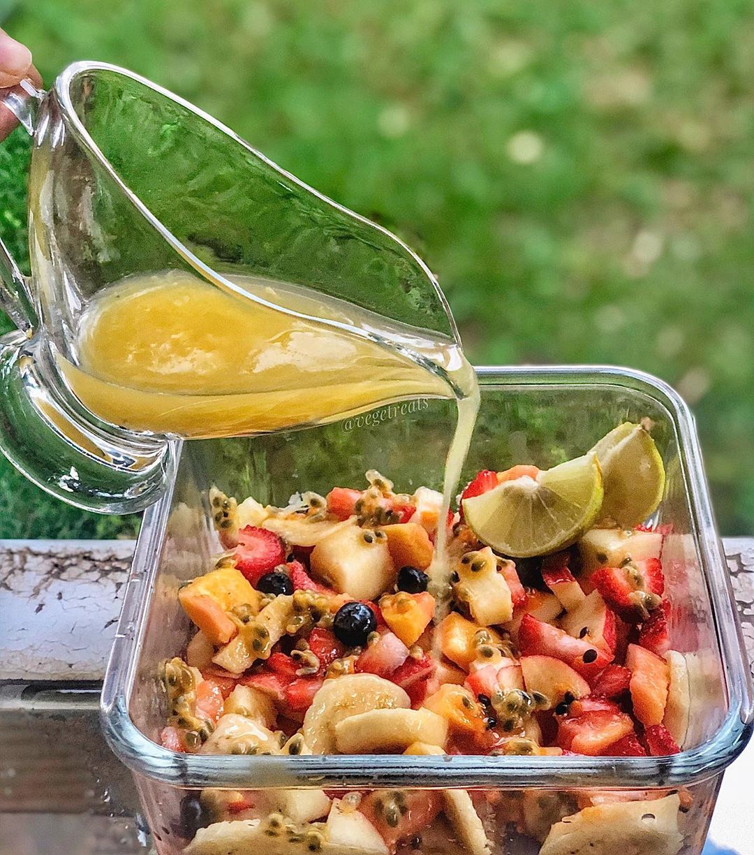 - Add the passion fruit and top with the dressing.